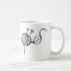 Weiße Tasse mit dem Mourning Project Logo und Stricknadeln/Garn