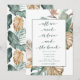 Tropische Blume "Alles was wir brauchen ist Liebe und der Strand" speichern Sie die Daten für Ihre Hochzeit am Strand. Hübsches tropisches Blatt- und Blume-Design, gedruckt in einem lässigen Skript und Block-Schriftart. Passen Sie Ihren Namen, Ihren Hochzeitstag und Ihren Ort an. Save the Date kehrt zur Koordinierung der Blattgestaltung auf der Rückseite zurück.