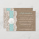 Die türkisfarbene Sandstrandhochzeit ist ein atemberaubendes Design mit einem hübschen rustikalen Burlap-Effekt-Hintergrund und einem romantischen Vintagen, weißen Spitzeneffekt, der mit einem atemberaubenden Sand-Dollar und türkisfarbenen Band vollendet wird. Diese Detailkarten können für Ihren besondere Anlass personalisiert sein und würden die passende Beilage für eine Hochzeitssuite, Brautparty, Verlobungsfeier, Geburtstagsparty und vieles mehr machen. Diese Karten können zum Erstellen von Einzelkarten, Gästeinformationskarten, Unterkunftskarten, Richtungskarten, Geschenkregistern oder WunschWell Cards sowie Zeremonie- und Empfang Cards verwendet werden. *Bitte beachten Sie, dass Zazzle nur gedruckte Einladungen verkauft, sodass diese Einladungen keine echten Einladungen, Spitzen, Sand-Dollar- oder Bandmaterialien enthalten.