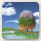 Vier Jahreszeiten erscheinen auf einem einsamen Baum stehend in einer Graswiese. Die obersten Äste sind kahl und schneebedeckt und weichen von rosa Blüten ab, die sich in dunkelgrüne Blätter verwandeln, die Orange und Gold umdrehen und zum Boden fallen. Inmitten der Herbstblätter auf dem Boden sind blaue Frühlingsblumen und schmelzender Schnee.