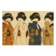 Ein elegantes digitales Kunstwerk, das die zarte Mystik der traditionellen japanischen Weiblichkeit einfängt. Die Komposition zeigt vier Geishas in einer Reihe nebeneinader, jede gekleidet in kunstvoll gemusterte Kimonos mit Farben von warmem Terrakotta und Senf Gelb bis zu dunkel Grün. Ihre anmutigen Haltungen und teils verdeckten Gesichter erzeugen eine stille Bescheidenheit und laden Betrachter dazu ein, über ihre Gedanken und Geschichten zu rätseln.