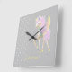 Die Wall-Uhr zeichnet sich durch ein niedliches Einhorndesign auf grauem Hintergrund aus.