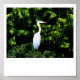Ein digitales Gemälde eines Großen Blauen Helden, weiß gestrichen, stehend auf einem Baum in einem Wald.