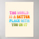 Wir stellen Ihnen unsere lebendige und herzliche Kreation vor: "Die Welt ist ein besserer Ort mit Ihnen darin"! Das soll Freude und Positivität in Ihr Leben bringen. Die sorgfältig ausgewählten Farbtöne harmonieren harmonisch, um ein visuelles Ambiente zu schaffen, das jedem Raum eine angenehme Note verleiht. 🌍 Inspirationsbotschaft: Im Kern dieses Designs steht eine kraftvolle Botschaft, die bei jedem, der sie liest, Resonanz findet. "Die Welt ist ein besserer Ort mit dir in ihr" dient als tägliche Erinnerung des immensen Wertes, den du der Welt und dem Leben derer um dich herum bringst.