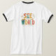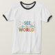 Der Text "See the World" breitet sich wie ein atemberaubender Sonnenaufgang über das Shirt aus. Die Buchstaben könnten ein lebendiger Verlauf sein, beginnend mit warmen Orangen und Pinken für "Sehen" und dem Übergang zu cooler Blues und Purples für "Welt". Dieses Design weckt das Versprechen neuer Anfänge und Abenteuer in verschiedenen Horizonten.