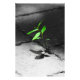 Eine hellgrüne Pflanze wächst durch Ziegelsteine und zeigt die Widerstandskraft der Natur gegenüber dem Menschen.