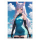 Eine faszinierende Figur aus Katzengewächsen mit fließenden silbernen Schlössern und ausdrucksstarken blauen Augen. Ihr modernes aquamarines Kleid und ihre dunklen Handschuhe bieten einen schlichten Kontrast zum dynamischen Himmel, ideal für Kunstdrucke und Bekleidung.