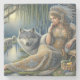 Unter dem ruhigen Glühen des Mondes, einer ruhigen Erholung durch einen Waldbach, strahlt ihre elegante Haltung Kontemplation aus. Mit einer verzierten Kopfbedeckung und Finesse, die den Wäldern eigene, komplizierte Muster widerspiegelt, teilt sie eine stille Gemeinschaft mit einem majestätischen grauen Wolf. Im Hintergrund verschmelzen die Schatten der Wölfe mit den Dämmerbäumen, was eine harmonische Verschmelzung von Wild und friedlichem Respekt schafft.