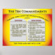 Die katholische Version der zehn Gebote mit der klassischen Augustiner Division der ersten drei und der letzten sieben. Diese beiden Divisionen sind auch mit den beiden Großen Geboten: Liebe Gott und Liebe Andere Es enthält die Schrift Referenzen für die beiden Alten Testamentlisten und die Liste Jesus verweist auf den reichen jungen Mann. Rot und Gelb erinnern sich an das Feuer, das um den Sinai wirbelte, als Moses den Decalog erhielt.