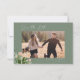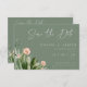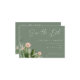 Moderne Save the Date-Karte mit Kakteen und sukkulentem Aquarellbild und moderner Kalligraphie auf einem schlauen Hintergrund. Auf der Rückseite der Karte befinden sich ein Salbeirahmen, das Foto der Paare und ein Text.