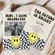 Cooles und lustiges Retro-Thema 3. Geburtstagsfeier Party Einladung mit Coolen Retrostilen mit kontrolliertem Muster und fröhlichem GesichtDer Text sagt "jung, wild und drei". Ideal für die Geburtstagsfeier eines Jungen. Moderne Retro-Vintage Spaß-Abschlussfeier Einladung Vorlage Karte mit handgeschriebenen Typografie-Skript, dass "die Zukunft ist hell." Unten ist ein schwarz-weißes kariertes Muster mit einem glücklichen Gesicht. Sie können das Foto des Absolventen auf der Kartenrückseite hinzufügen.