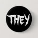 Schwarzer Hintergrund-Rundknopf mit dem Wort "THEY" in allen Kaps in einem Schriftart, der dem, was Metalbands auf ihren Albumcover verwenden, ähnlich ist.