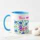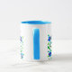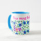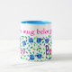 Eine weiße Ringer-Tasse mit einem pulvrigen, blauen Rand und Griff, mit einer handbemalten, blumengeschmückten Papiercollage und den Worten "Diese Tasse gehört zu Bev". Spülmaschinen und Mikrowellen geeignet.