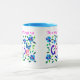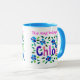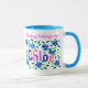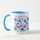 Eine weiße Ringer-Tasse mit einem pulvrigen, blauen Rand und Griff, mit einer handbemalten, blumengeschmückten Papiercollage und den Worten "Diese Tasse gehört zu Chloe". Spülmaschinen und Mikrowellen geeignet.