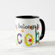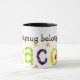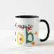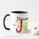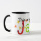 Eine hochwertige weiße Ringer-Tasse mit schwarzem Rand und Griff. Das Design ist eine handgemalte Papiercollage mit dem Namen Jacob in großen Buchstaben mit Sternen bestreut. Spülmaschinen und Mikrowellen geeignet. Siehe auch passende Grußkarte und Geschenke.