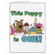 T - Shirt zum ersten Geburtstag von Welpen, Körperanzüge, Magnete, Karten, Totentaschen, 1. Geburtstagsknöpfe und mehr mit einer Geburtstagsküche, einem bezaubernden braunen Welpen, einem Party Hut und vielen Geburtstagsgeschenken!