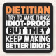 Funny Dietitian Redewendungen "Dietitistin Ich versuche, die Dinge Idiot Beweis, aber sie Behielt, besser Idioten". Nimm dieses Funny Dietitian Design als lustige Geschenke für eine phantastische Mutter, einen Vater oder einen Freund.