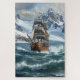 Das Bild ist eine digitale Abbildung eines Segelschiffs im Ozean. Das Schiff ist ein hochgewachsenes Schiff mit mehreren Masten und Segel, und es scheint in eine Berglandschaft zu segeln. Der Himmel ist bedeckt, das Wasser ist stürmisch, kleine Wellen stürzen um das Schiff herum. Die Berge im Hintergrund sind von Schnee und Eis bedeckt, und die Stimmung des Bildes ist dramatisch und beeindruckend inspirierend. Die Farbtöne sind überwiegend gedämpft, mit einigen blauen und grünen Farbtupfern, die den Eindruck einer kalten und trostlosen Landschaft vermitteln.
