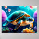 Farbenfrohe Fantasy Digital Art Printing mit seitlicher Seeschildkröte, magische Blasen und Korallenarten. Mit AI-Software erstellte Bilder.