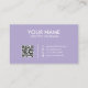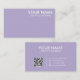 Diese bearbeitbare Visitenkartenvorlage ist eine moderne und einfache Möglichkeit, sich und Ihr Unternehmen zu präsentieren. Es hat einen digitalen Lavendelhintergrund, der ein beruhigendes und entspannendes Aussehen schafft, ein minimalistisches Design, das Ungestörtheit und Ablenkung vermeidet, und einen weißen Text, der hervorstecht und Aufmerksamkeit erregt. Es hat auch einen QR-Code, der auf Ihre Online-Präsenz verlinkt.