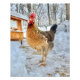 Dieses Foto druckt eine schöne Leghornhenne, die vor ihrer Zuhause in Connecticut posiert.