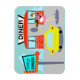 Mit dem Diner Flexi Magnet aus den 50er Jahren können Sie hier etwas ganz Besonderes genießen. Der Cartoon zeichne ein Gebäude aus rotem Ziegelstein mit blauen Fenstern, graue Doppeltüren und ein weißes Schild, auf dem steht: "Diner" auf dem Dach. Auf dem Parkplatz befindet sich ein zweites Schild auf dem Pol. Das Schild hat einen türkisfarbenen Hintergrund und einen blinkenden roten Pfeil, der den Weg zu "Don's Diner" zeigt. Das Schild hat seine Arbeit getan, weil es ein hellgelbes Auto mit Flossen neben dem Auto gibt. Auch wenn wir sie nicht sehen können, müssen die Fahrgäste des Autos ihre Lippen schlagen. Ein niedlicher, junger Sklave rollt gerade ihren Weg zum Auto. Ihr brünettes Haar ist in einem bounzigen Pferdeschwanz. Sie trägt eine kurze, rosa Uniform mit schwarzem Schnitt und einer weißen Schürze. Auf der einen Seite ist der Skischof mit einem schwarzen Tablett mit einem riesigen Hamburger und einer erfrischenden, altmodischen, gläsernen Flasche Soda ausgestattet. Der Hintergrund hinter dem Restaurant ist mit hellblauen Wolken und den Silhouetten von Zedernbäumen aquamarin.