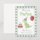 Watercolor kids birthday party. Watercolor Dino with birthday hat, cake with candles, red balloon. Green cage background.