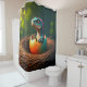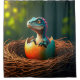 Dieser Duschvorhang hat einen Dinosaurier, der aus dem Ei geschlüpft ist.
