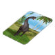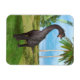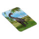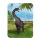 3D digitale Darstellung eines Dinosauriers Brachiosaurus auf dem Hintergrund des blauen Himmels und der grünen Palmen