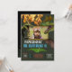 Ein cooles, lustiges und modernes Design, das sich durch rauschende Tyrannosaur-T-Rex-prähistorische Tiere auszeichnet, und ein fliegendes Pterodactyl, umgeben von leuchtenden roten Flammen und bedrücktem Text in schwarzem, blauem und orangefarbenem Set, auf dunkelgrünem Hintergrund. Die Dinosaurier stehen auf ihren großen Zähnen, und sowohl die Vorder- als auch die Rückseite können personalisiert sein. Personalisieren Sie das Foto mit einem Bild des Geburtstagsjungen. Ideal für Ihren Sohn, der einen Geburtstag mit einem Dino-Thema feiert.