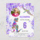 Lila Aquarelltasche Dino 6. Geburtstagsparty Einladung für das Mädchen, das Dinosaurier Liebe. Diese farbenfrohe Roaring T Rex und fliegendes pterodactyl laden Dino Fans zu einer lustigen sechsten Geburtstagsfeier ein. Multicfarbener Tyrannosaurus rex und Pterodactyl in lebendigem rosa lila blau grün und aquamarin Personalisieren Sie dieses psychedelische jurassische Dino-Design mit einem Foto, die Anzahl der Geburtstage und die Party Details und Sie sind alle Set für einen lustigen Dinosaurier-Thema Dino Geburtstag. Alle Dinosaurier-Arten sind willkommen. Original-Kunstwerk Illustration von Catherine Sweetman
