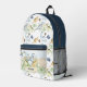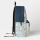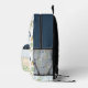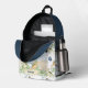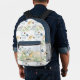 Niedlicher Rucksack mit Dinosauriern und Fußabdrücken, umgeben von blauen, grünen und gelben Pflanze. Personalisieren Sie einfach den Namen oder geben Sie ein Monogramm ein. Ideal für den Sommerurlaub oder als Schultasche und mehr - Kate Eden Art
