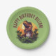 Die Dinosaurier-Teller der Fun-Kind-Geburtstagsparty bieten T-Rex mit Sonnenuntergang und tropischen Pflanze auf grünem Hintergrund. Stellen Sie sicher, dass Sie die passenden Dinosaurier-Party-Vorräte Karo!