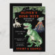 Eine Dino-Milbe-Dinosaurier-Geburtstagsfeier mit einem T-Rex und Brontosaurus, uralten Palmen-Blätter und einem ausbrechenden Vulkan. Eine Szene aus der Morgendämmerung, mit farbigen Typografien in Rot und Grün auf schwarzem Hintergrund. Schwarz auf der Rückseite der Einladung. Kühl und freundlich. Dieser freundliche Dino ist nicht zu beängstigend für kleine Kinder!