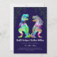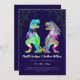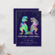 Delight your guests with this funny dinosaur-themed wedding invitation, featuring a charming T-Rex bride and groom in pink, blue, teal, green, purple, yellow and brown hues surrounded by lush green eucalyptus jungle foliage. Set against an elegant navy blue background, this bold and modern design is perfect for couples who love dinosaurs and want to add a playful twist to their special day. Perfect for fall autumn, winter, spring or summer weddings.