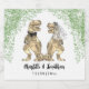 Freuen Sie sich auf diese lustigen Dinosaurier-Hochzeitsfeiern mit eigenen Weinetiketten. Fun Dinosaurier Braut und Bräutigam in braunen Tönen und grünem Eukalyptusblättern. T-Rex dino Braut und Bräutigam mit leicht zu personalisieren Braut und Bräutigam Namen und das Hochzeitdatum in modernen whimsical Typografie Skript. Originelle Dino-Kunstwerke der Künstlerin Catherine Sweetman