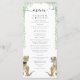 The design showcases detailed watercolor dinosaur artwork in warm brown hues, paired with soft green eucalyptus leaves on a crisp white background for a stylish romantic yet fresh and natural look. The layout is easy to customize with your names, wedding date, and personalized wedding menu details all presented in a stylish mix of modern script and clean typography.
