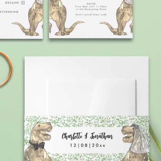 Dinosaurier Thema Hochzeit Einladung UAWG Antwort Karte mit lustigen Dinosaurierbride und Bräutigam mit Wasserfarbe botanischen Grün zu bringen prähistorischen Jurassic Freude an Ihrem Hochzeitstag. Moderne whimsical Typografie Kalligraphie mit leicht zu personalisierenden Vorlagen. Einzigartige T-Rex Braut und Bräutigam in Braun- und Eukalyptusblättrigen grünen Aquarelltönen. Originelles Kunstwerk der Künstlerin Catherine Sweetman Ideal für den Hochzeitstag Empfang oder Probe Dinner. Die passende Hochzeitssuite beinhaltet alles, was Sie für Ihre lustige Hochzeitsreise benötigen