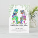 Freuen Sie sich auf diese lustige, farbenfrohe, psychedelische Dinosaurier-Einladung mit lustigen Dinosaurier-Braut und Bräutigam. Einfach mit den Namen der Braut und der Bräuche, dem Hochzeitstermin und allen Details des Hochzeitsortes in modernem Typografie-Skript anpassen. Fun T-Rex Braut und Bräutigam Illustrationen in rosa lila-blau-grün gelb und orange mit Dschungelblättern in grünen Farbtönen. Originelle Dino-Kunstwerke der Künstlerin Catherine Sweetman
