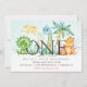 Dinosaurier Thema 1. Geburtstagseinladung mit drei Dinosauriern. Die Rückseite der Einladung hat ein tropisches Vegetationsmuster.