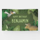 Desteis originelle niedliche Cartoon-Illustration von verschiedenen Dinosauriern zusammen mit einem grünen Dschungelblättern Pflanze. Die Dinosaurier sind Tyrannosaurus / T-rex, Triceratops, Pteranodon und Brachiosaurus. Die Hintergrundfarbe ist grün. Es gibt auch zwei personalisierbare Textbereiche. Einer der Beispieltexte lautet nun: "Happy Birthday", während der andere Platz für einen individuelle Name hat. Der Schriftart ist hellgrün.