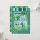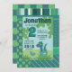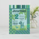 Blaue, grüne prähistorische Landschaft, Baby Dinosaurier Junge in Ei Muschel Geburtstagsfeier Einladung. Dino Party für Kinder, modernes Muster mit niedlichem Dino Cartoon. Einladungskarte für Geburtstagsjunge, die individuell angepasst werden kann.
