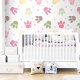 Niedliche Tapete für ein Mädchenzimmer mit farbenfrohen Dinosaurier-Fußabdrücken in Rosa und Pastellfarben auf weißem Hintergrund. Ideal für Mädchenzimmer, Kinderzimmer oder Spielzimmer, für alle Dinosaurier-Liebhaber - Kate Eden Art