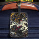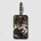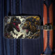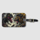 Dieser Gepäckanhänger hat einen Dinosaurier, der einen Löwen darauf kämpft.