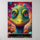 Whimsikaler und lebendiger Dinosaurier, der eine Mischung aus Fantasie und prähistorischem Charme zu sein scheint. Der Dinosaurier hat einen langen Hals und einen großen Kopf, mit einem mit Augen Ausdruck mit fesselnden, übergroßen Augen, die ihm einen niedlichen und merkwürdigen Look verleihen. Ihre Haut ist mit farbenfrohen, wirbelnden Formen und Punkten verziert, fast so, als ob ihr Körper mit einem Kaleidoskop von Texturen in Blues, Grüntöne, Gelb und Purpur gemalt wird. Der lebendige Hintergrund mit seinem schwindelerregenden Himmel und den abstrakten Planeten vermittelt den Eindruck einer anderen Weltlandschaft, was darauf hindeutet, dass der Dinosaurier in einer surrealen, fantastischen Welt liegt. Die hellen, übertönten Farben und die spielerischen Merkmale verleihen der Kreatur einen freundlichen, animierten Charakter, ideal für einen magischen oder traumhaften Rahmen. Dieser Dinosaurier könnte zu einer imaginierten Spezies aus einem kosmischen Bereich gehören, wo Flora und Fauna in lebendigen, psychedelischen Ökosystemen gedeihen und prähistorisches Leben mit einer Drehung im Weltraumzeitalter verbinden. Sein Benehmen verströmt Unschuld und Staunen, als ob es sein fantastisches Universum zum ersten Mal erforscht.