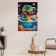 Whimsikaler und lebendiger Dinosaurier, der eine Mischung aus Fantasie und prähistorischem Charme zu sein scheint. Der Dinosaurier hat einen langen Hals und einen großen Kopf, mit einem mit Augen Ausdruck mit fesselnden, übergroßen Augen, die ihm einen niedlichen und merkwürdigen Look verleihen. Ihre Haut ist mit farbenfrohen, wirbelnden Formen und Punkten verziert, fast so, als ob ihr Körper mit einem Kaleidoskop von Texturen in Blues, Grüntöne, Gelb und Purpur gemalt wird. Der lebendige Hintergrund mit seinem schwindelerregenden Himmel und den abstrakten Planeten vermittelt den Eindruck einer anderen Weltlandschaft, was darauf hindeutet, dass der Dinosaurier in einer surrealen, fantastischen Welt liegt. Die hellen, übertönten Farben und die spielerischen Merkmale verleihen der Kreatur einen freundlichen, animierten Charakter, ideal für einen magischen oder traumhaften Rahmen. Dieser Dinosaurier könnte zu einer imaginierten Spezies aus einem kosmischen Bereich gehören, wo Flora und Fauna in lebendigen, psychedelischen Ökosystemen gedeihen und prähistorisches Leben mit einer Drehung im Weltraumzeitalter verbinden. Sein Benehmen verströmt Unschuld und Staunen, als ob es sein fantastisches Universum zum ersten Mal erforscht.