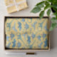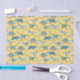 Viele blaue Dinosaurier auf einem gelben Hintergrund. Tyrannosaurus Rex, Spinosaurus, Stegosaurus, Diplodocus und Triceratops. Ideal für aufstrebende Paläontologen! Originelle Kunst von Nic Squirrell.