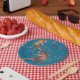 Großartiges Dinosaurier-Design für Geburtstagspartys! T-Rex, lange Nacken, fliegende Dinosaurier Fußdrucke und Vegetation.