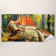 Dieses Strandtuch hat einen Dinosaurier, der darauf abgebildet ist.