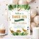 Diese bezaubernde Geburtstagseinladung beinhaltet tropische Aquarellfarben-Blätter mit Goldfolienschmuck und Golddinosaurier-Silhouetten.